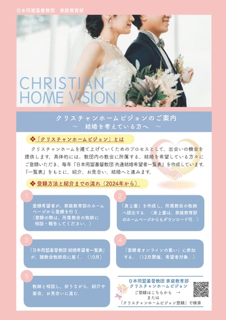 ・牧師に相談して、クリスチャンホームビジョンへ登録しましょう。所定の身上書に記入して、牧師に提出して下さい。